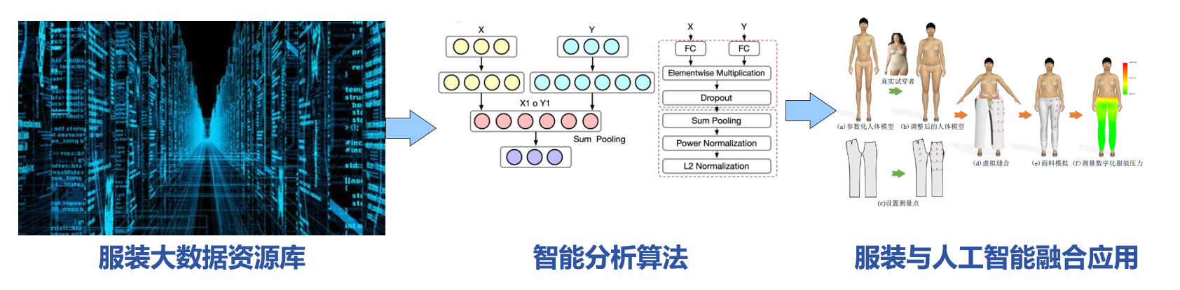 主要研究人工智能技术与方法,面向复杂的海量服装大数据智能分析和计算方法,以及智能信息技术在纺织服装领域的应用,包括多模态数据特征提取与融合,用户行为分析与智能推荐、基于机器学习的服装合体性评估技术研究。